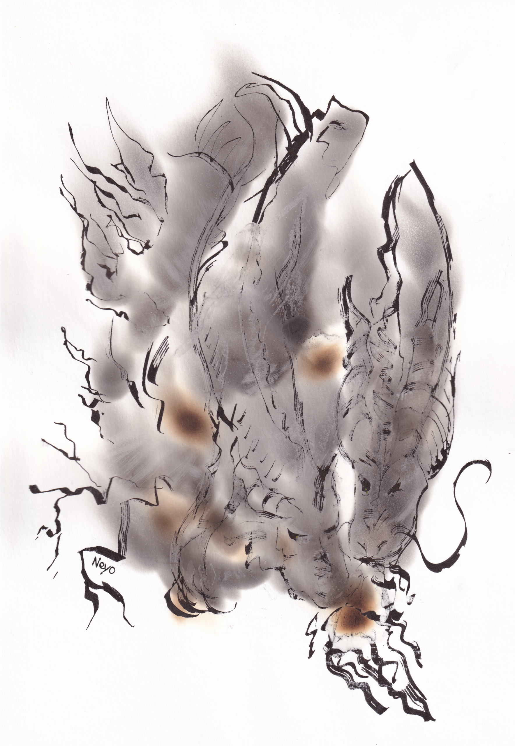 Esta colección está formada por ilustraciones realizadas con la técnica fumage la cual tiene origen en el surrealismo por el artista Wolfgang Paalen. Esta técnica consiste en dibujar con el humo que emerge de la llama. Por lo cual se necesita de un buen control para que la mancha que quieres realizar no acabe en una quemadura en el papel. Junto esto he aplicado tinta y grafito para retocar estas manchas creadas por el humo.