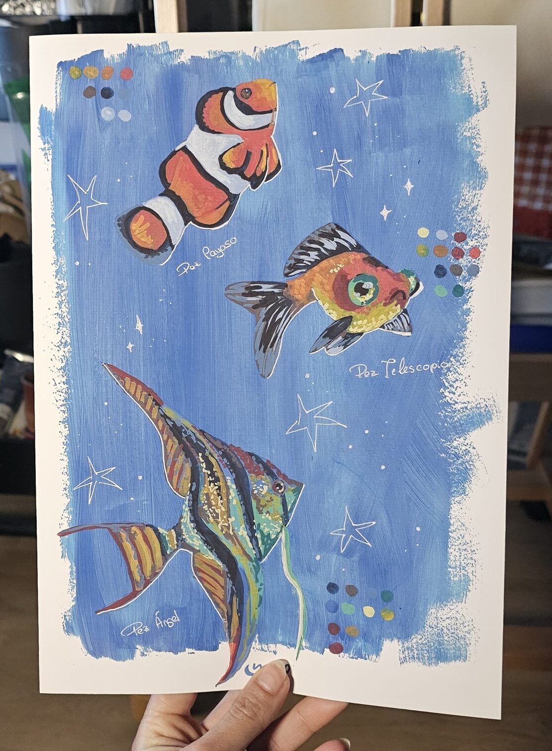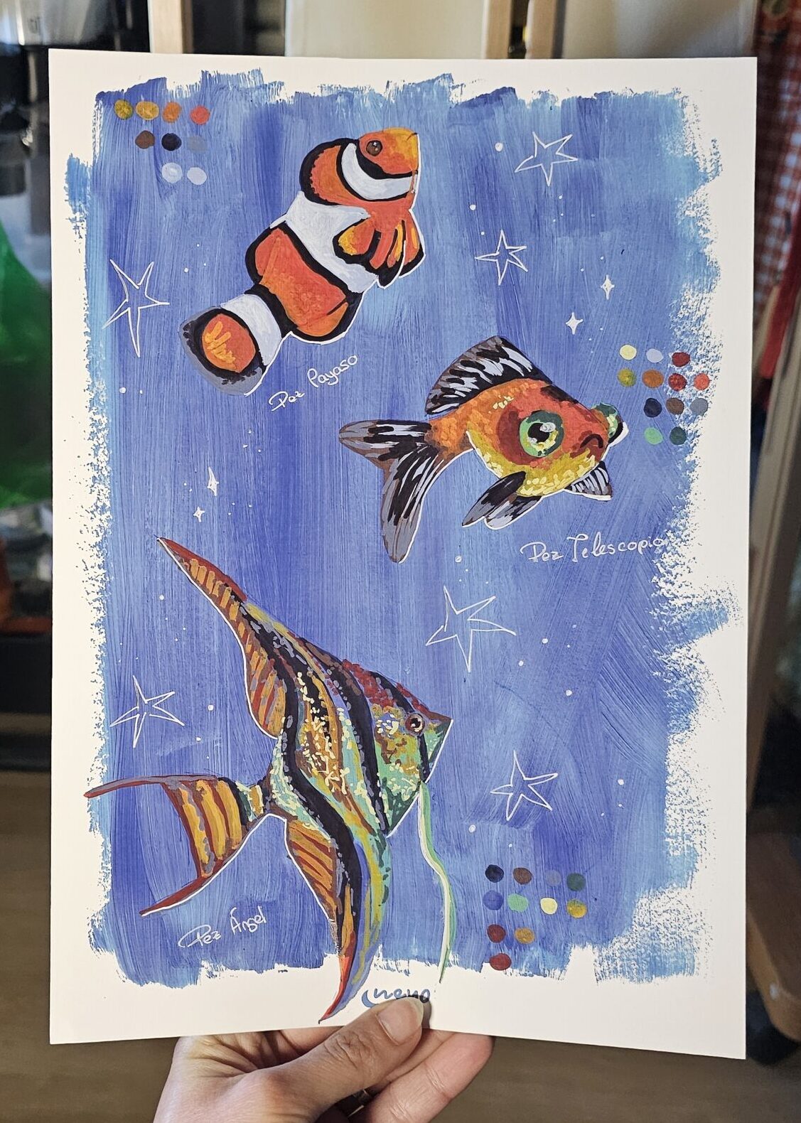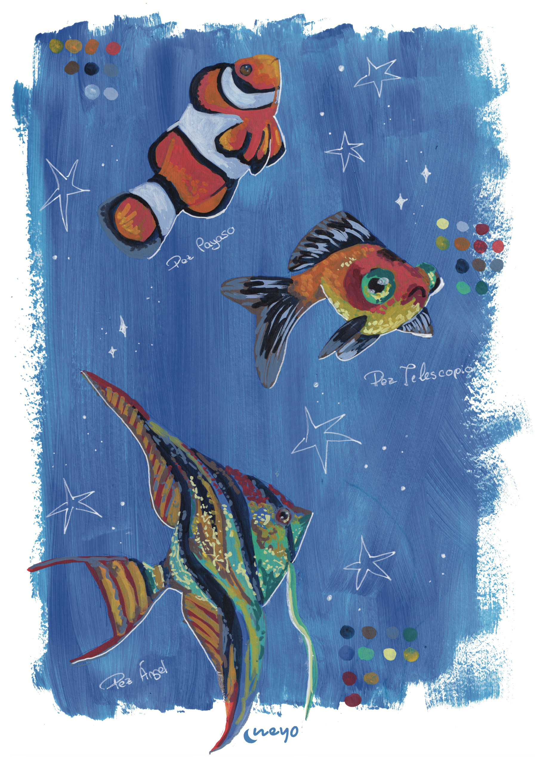Lámina gráfica de un estudio de peces que realicé con rotuladores acrílicos.